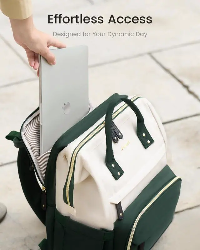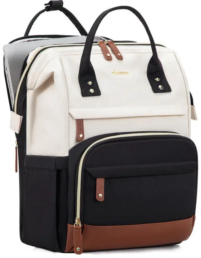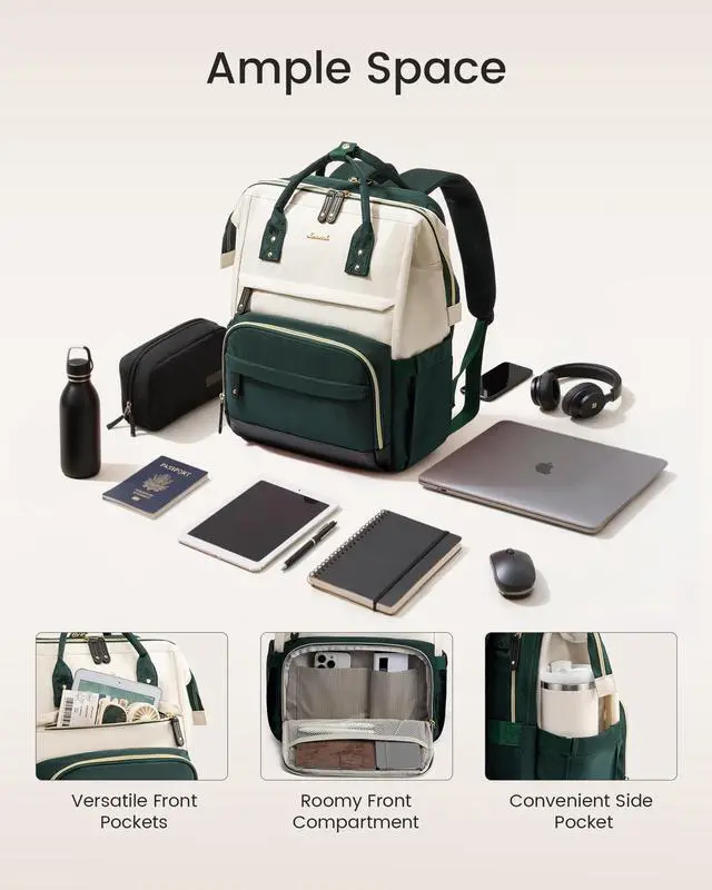 Large Capacity Work BackpackLOVEVOOK backpack purse for women uses a rectangular frame opening design to maintain large capacity and facilitate your quick access. ^^ Multi-Compartment Laptop backpack Laptop backpack has a total of 5 compartments and 17 pockets, which are convenient for your organization and storage. Not include USB port and inside cup pockets ^^ DimensionContains a separate computer compartment that can accommodate 15.6 inches and an iPad slot that can accommodate up to 12.9 inches. ^^ Anti-Theft PocketLuggage strap allows you to easily fix your backpack on the trolley case. The anti-theft pocket on the back makes your valuables safer and your travel easier.