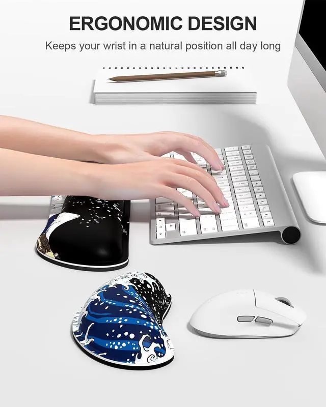 Mouse Pad Set: The ergonomic wrist rest is filled with memory foam to offer superior comfort and effective support, helping to alleviate wrist strain that can lead to repetitive motion disorders. Perfect for people who spend long hours on computer.