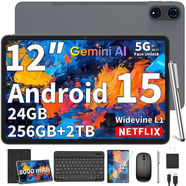12 Inch 2K Display + Widevine L1The android tablet features a stunning 12 inch 2K large display eye protection screen, 1200*2000, delivering an immersive visual and entertainment experience. With Widevine L1 certification, enjoy 1080P HD content on Netflix, YouTube, HBO, or Prime Video. Paired with stereo dual speakers, tablet makes watching shows and movies feel like you're right there in the moment. The 12 inch tablet supports split-screen for efficient multitasking ^^ 24GB RAM + 256GB Storage (Expandable up to 2TB) The Android 15 tablet features 24GB RAM (8GB RAM + 16GB extended) and 256GB ROM, allowing you to store more photos and documents.