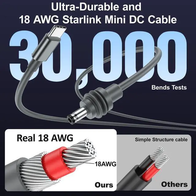 Smart Chip & 18AWG Starlink Mini Power CableOur Starlink Mini USB-C to DC Power cable integrated with PD smart chip to achieve high-speed power and data transmission. Intelligently recognize the voltage and current required by Starlink Mini.In addition,the Starlink Mini USB C cable is equipped with thick 18AWG copper wires to guarantee stable and reliable performance, ensuring optimal internet connectivity.Enjoy delay-free and lag-free network signal.