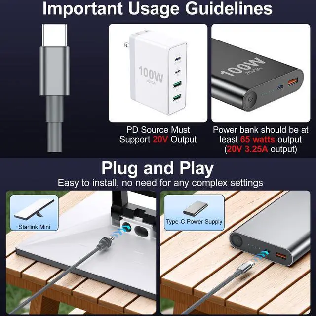Perfect Fit for Starlink MiniThis Starlink mini USB C cable is specifically designed to power your Starlink Mini satellite dish and Starlink accessories while on the go.Whether you're traveling in your car, RV, or truck, this Starlink mini power cable ensures a stable and reliable power connection,so you can enjoy seamless internet access anywhere. *NOTE: Please choose a power bank or PD power adapter that support PD protocol at least 65W (20V/3.25A).