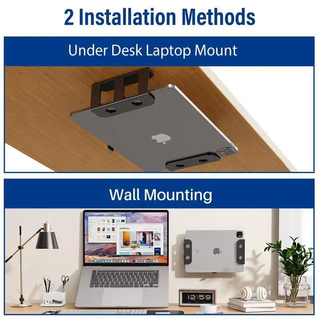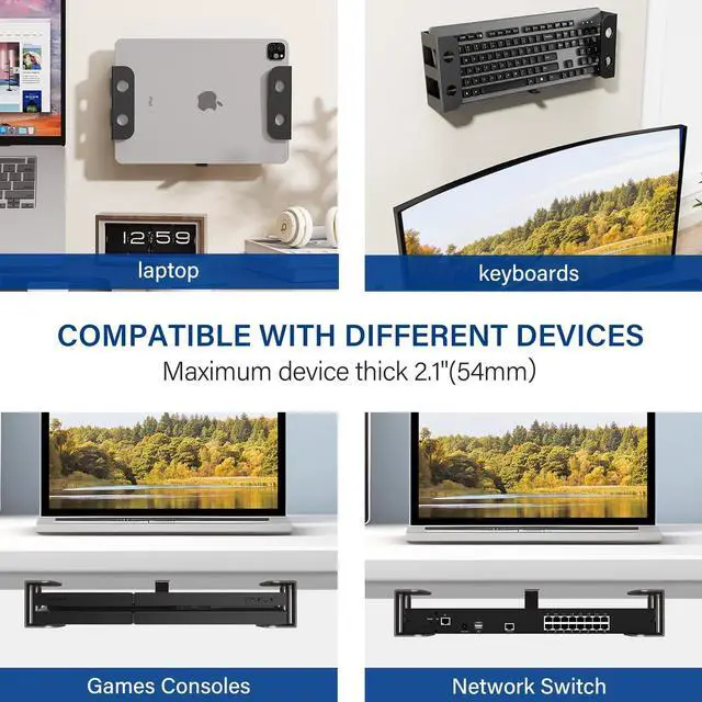 Space Saving: Our laptop stand sits under the table, saving valuable desktop space and bringing you great convenience. It not only supports laptops, but also suitable for devices up to 2.1 inches thick. for Macbook, laptops, Mac Mini, cable boxes, modems, smart TV boxes and more. It can effectively save space, keep leg room and prevent your legs from being impacted! It also keeps your desktop environment cleaner and more organized ^^ High