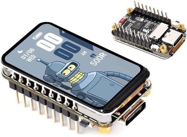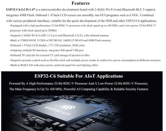 ^^ 1.47 inch Display: Onboard 1.47 inch LCD display, 172x320 resolution, 262K color. Can run graphical interface programs such as LVGL smoothly, suitable for human-machine interaction (HMI) application development. Built-in RGB LED with clear acrylic sandwich panel for cool lighting effect.