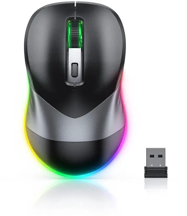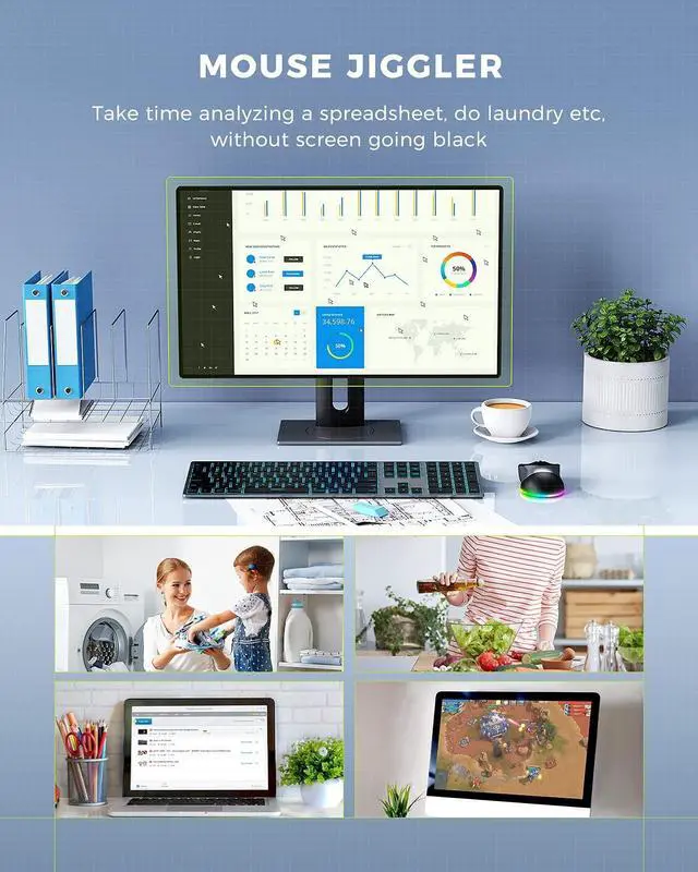 Mouse Jiggler & Rechargeable LED Mouse 2 in 1 Design -- If you are doing your work on the computer, this would be a actual mouse with amazing LED colors, if you're not typing away or step away from your computer, this would be a Mouse mover which give you a little breathing room without having to worry about logging back into all your programs again (You will have to press the DPI button for 3 seconds to enter into jiggler mode) ^^ Random Movements & No Interfere with using Mouse -- The mouse produces random movements on the screen and it is very quiet in Jiggler Mode, when you back to the computer, no need to draw attention to the fact that you're using a jiggler, the cursor is under your control! It will enter Jiggler mode again after 5 seconds of inactivity ^^ Plug & Play Perfect for Laptops Only with Limited USB Port -- There is virtually no set up, you literally just plug it in and turn on the switch it works! Only 1 real mouse will be plugged in your computer, so no worries if you use using it with your laptop that only has 1 or 2 USB ports, and not bother to buy an adapter ^^ Separate On/Off Control for the Mouse and Jiggler Mode -- It serves its purpose and can be turned on and off, gives you simple and effective control, so you dont have to plug it in and unplug it, cause not all the time you will need to run it ^^ Universal Compatibility & 12 Months Warranty -- Compatible with almost all USB-enabled Computers run of Windows XP, Windows 7, Windows 8, Windows 10, Mac OS.
