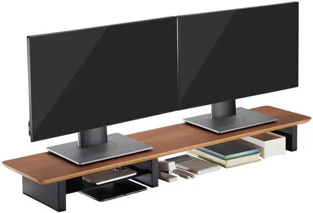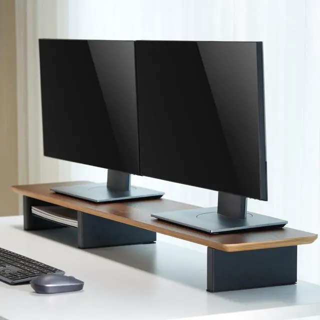 Viral on TikTok! Join thousands whove transformed their desk setup with this trending dual monitor stand. Search ivewoodworks on TikTok to see real user setups and why creators cant stop raving about it! ^^ Premium Walnut Plywood Construction Crafted from high-quality walnut plywood, this monitor stand offers a sleek, durable surface with a rich wood grain finish that adds warmth and elegance to any workspace. ^^ Thoughtful, Durable Design Includes protective pads to prevent desk scratches, a felt-lined slim metal mid-shelf for added organization and style, and sturdy metal legs built to support dual monitors with rock-solid stability.