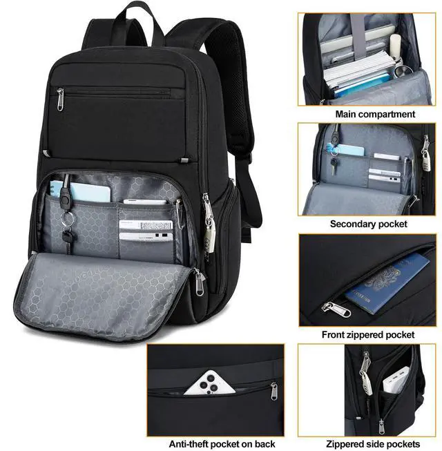 Laptop backpacks dimension: 12.6 x 6.69 x 17.72". Multiple compartments with 16-inch laptop sleeve that fits 13, 14, 15 and 16 inch notebook laptop. Includes an iPad compartment for a 9.7 -inch iPad ^^ Ample Storage Space & Pockets - The spacious main compartment offers plenty of room for daily necessities and tech accessories. The front compartment includes multiple pockets, pen holders, and a key fob hook, ensuring your items stay organized and easy to locate ^^ Water Resistant & Heavy Duty Backpack - This large backpack is crafted from 900D thickened fabric, making it water-resistant, abrasion-resistant, and tear-proof. It features adjustable, wide S-shaped breathable shoulder straps that prevent slippage and provide a better fit for your body shape and shoulders ^^ Backpack with Luggage Strap - This laptop bag fits securely on luggage or a suitcase, sliding over the upright handle for easier carrying. A hidden anti-theft pocket on the back protects your valuables, while durable metal zippers and a password lock provide added security ^^ Versatile Usages - With its sleek and stylish design, this bagpack functions as book bags, schoolbag, laptop backpack, computer backpack, work backpack, business backpack for men, commuter backpack, travel bag, personal item backpack and backpack for college.