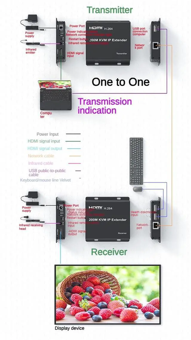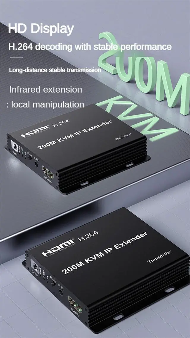 Product Description: 200m HDMI cable extender is a standard TCP/IP protocol through the LAN transmission of high-definition audio and video equipment, can be your DVD, player, computer and other equipment HDMI video CAT5E/6 cable transmission, the distance up to 200 metres; at the same time convenient to use one-to-one, one-to-many and cascade way for transmission of HDMI high-definition audio and video signals. Product Features. Support H. 264 codec. Supports one-to-one, one-to-many and cascade transmission; Standard 802.3 Ethernet; Support infrared extension; * Support USB mouse, keyboard extensionSupport USB mouse and keyboard extension; * Support touch screen operationSupport touch screen operation; Pure hardware design, plug and play, no need to install additional software. Specification.