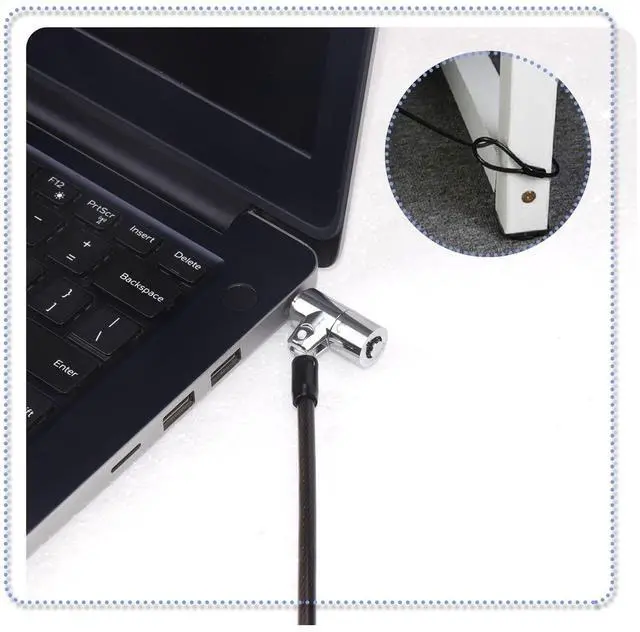 Universal Wedge Slot Compatibility Designed for laptops and other devices with a 6x 2.5 mm wedge slot, this lock ensures a secure fit (check compatibility before purchase). ^^ Simple & Quick Locking Just insert the laptop lock into the wedge slot, press to secure, and loop the lock cable around a fixed object. Keep the fixed lock core partially out so that the key can be turned. ^^ 6.7 ft Extra-Long Cable The extended security cable with lock provides flexibility to tether your laptop to desks, shelves, or other fixed objects in offices, libraries, or cafes.