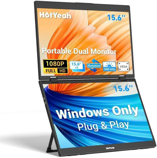 Note: For phone and tablet, it only supports mirror mode. ^^ Versatile Foldable Monitor- The 360rotatable upper screen allows you to share the screen with your friends or colleagues in all directions. With a screen rotation button, simply press and flip your laptop screen 180 in face-to-face discussions. With a 3.5 lbs weight and 3.1 slim metal frame, though this monitor has 2 screens, it can be folded up and carried like a laptop, portable for trips. Support extend/mirror/splice/portrait/shared modes and bring your perfect multi-screen display experience. ^^ 1080P FHD Screen Extender- With two stacked 15.6 IPS LCD matte panels, HotYeah dual portable laptop monitor offers you 178view angle, 300nits brightness, 100% sRGB color gamut, and 1:1000 contrast ratio, bringing you a more true-to-life picture and a larger 23.8 visual space. Its vertical layout and split mode make you easily handle editing and programming work without switching tags frequently. Flicker-free low blue light tech helps greatly reduce eyestrain after a long-time watch. ^^ Staked Ergonomic Design- With a built-in 90 adjustable kickstand, you can freely adjust the dual monitor to any comfortable angle.