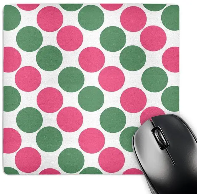 Pink And Green Dots Mouse Pad is 8" x 8" x. 25" and is made of heavy-duty recycled rubber. Matte finish image will not fade or peel. Machine washable using a mild detergent and air dry.