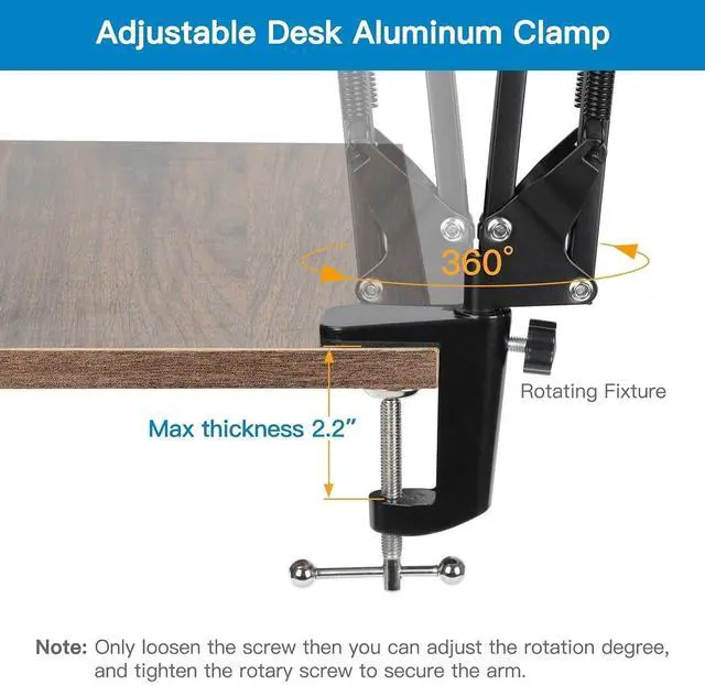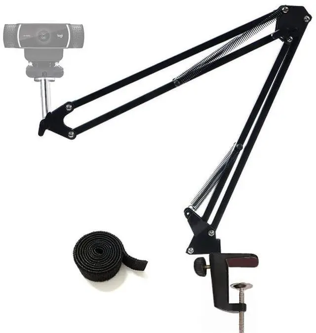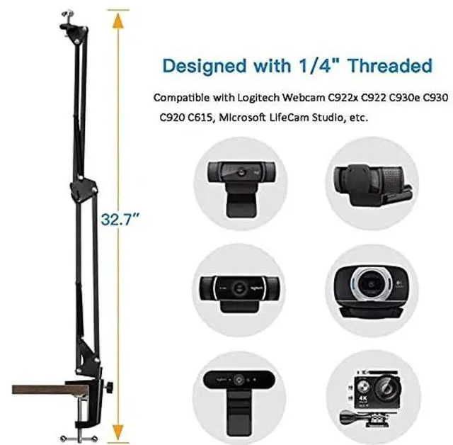 ThreadFeatures: - Scissor arm stand with 1/4 standard screw thread, specially designed for Logitech Webcam C922x C922 C930e C930 C920 C615, Brio 4K, micrrophone Shure MV5 and other devices with 1/4" thread. - Made out of high quality steel frame with super-strong springs, very sturdy and durable, designed for supporting devices up to 4.4 pounds / 2KG. - Dual suspension springs on each boom arm, very stable for using your device without shake and prevent device from suddenly dropping. - Folding type, convenient to carry around, and scissor arms with adjustable screws allow you adjust the suitable angle & height to show perfect image. - Anti-scratch padded zinc alloy desk clamp mount fit up to 2.1" desktop, Anti-skidding & anti-dropping webcam connecting pole with 1/4" thread, Extend arm up to 28" / 70cm. - Come with 24" length fastening straps for cable management.