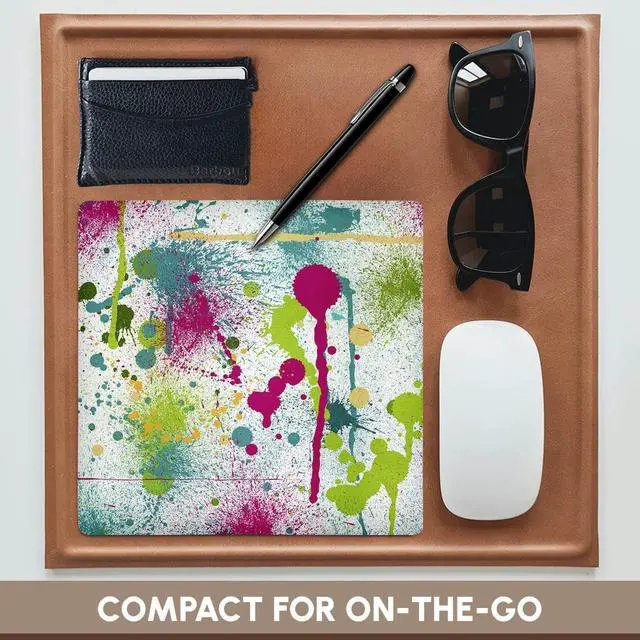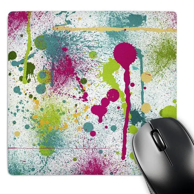 Funky Paint Splatters Mouse Pad is 8" x 8" x. 25" and is made of heavy-duty recycled rubber. Matte finish image will not fade or peel. Machine washable using a mild detergent and air dry.