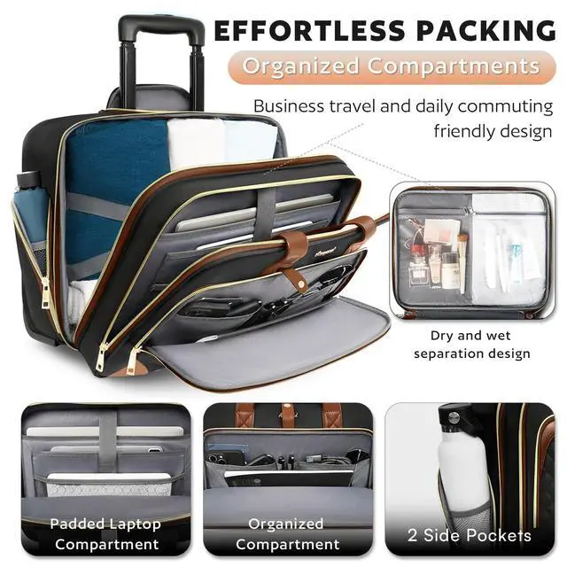 TSA-Friendly & Spacious Compartments: Rolling Computer Bag for women enjoy hassle-free airport with the TSA-friendly design, The size of the overnight bag with wheels is 17.5 * 13.7 * 7.0 inches (L*W*H). opening 180 degrees for quick security checks. The main compartment of this rolling briefcase for women for work features elastic bands with buckles for 2-3 days clothes. Theres also a separate padded laptop pocket, and organizational areas for pens, documents, Can also store paperwork, binder ^^ Elegant Design with