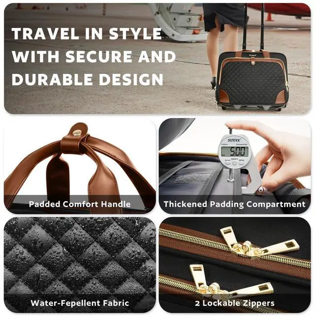 Waterproof Pockets & Superior Protection: Designed with built-in waterproof pockets, this laptop bag with wheels for women protects your valuables from unexpected spills. Or you can place wet clothes. The padded laptop compartment secures laptops up to 16 inches. 5mm waterproof-coated polyester on the bottom and sides prevents damage from scratches and bumps ^^