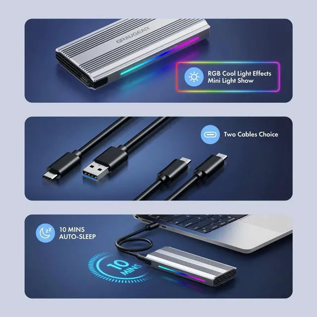 2 SSD without any tools. Plug and play, tool-less, portable and no driver needed ^^ fixture, screwdriver, screw, thermal pad, warranty card, manual and friendly customer service. RGB LED StripsWith exclusive RGB gaming lighting technology, it provides ambient lighting that perfectly complements your gaming rig for true expression of your individuality ^^ Stability and SafetyNVMe PCIe reader adopts an advanced RTL9210 controller that built with short-circuit, over-current and multi-protection to ensure safety for your SSD and valuable data