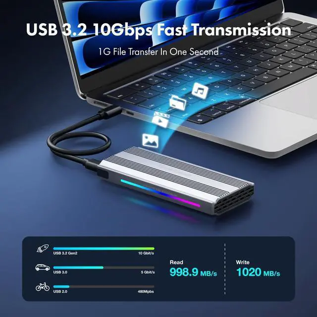 10Gbps High-SpeedUSB 3.2 Gen2 RTL9210 chipset supports USB-C(USB Type-C) connection and data transmission speed up to 10Gbps for steady and efficient data transfer. Backward compatible with USB 3.1 and 3.0 at respective speed limits ^^ Efficient Heat DissipationRemoving the space between the SSD and thermal pads allows for better heat dissipation through the aluminum shell and the heatsink on the surface of the M. 2 SSD enclosure adapter. Effectively protect your SSD from overheating, extending its longevity and keep high transfer rate ^^ Highly ConvenientTool-free design allows easy installation and quick removal of your M.