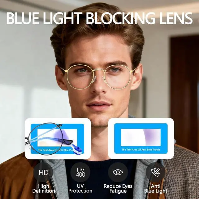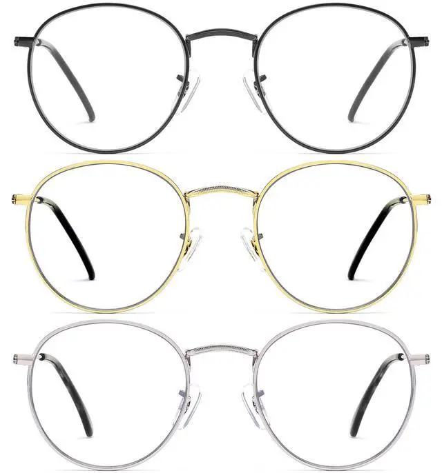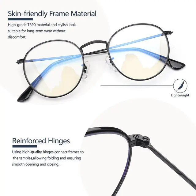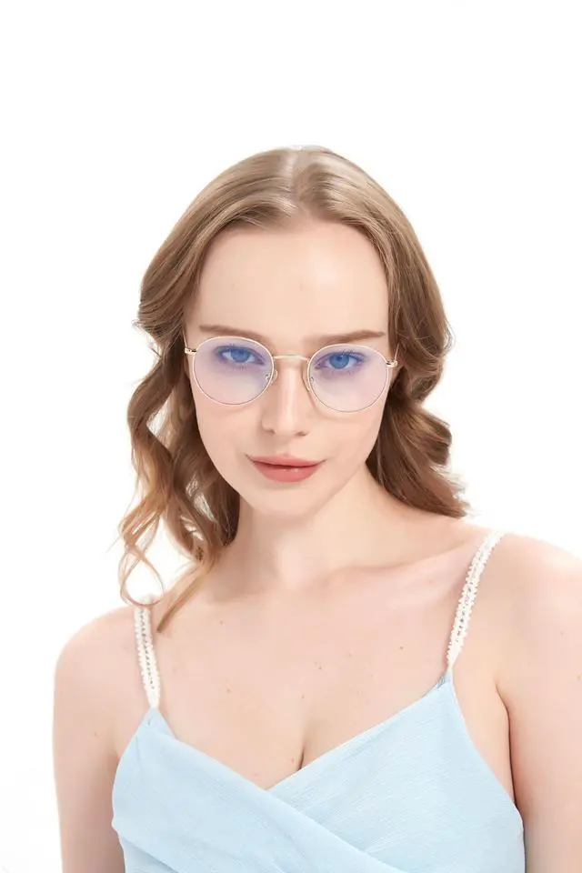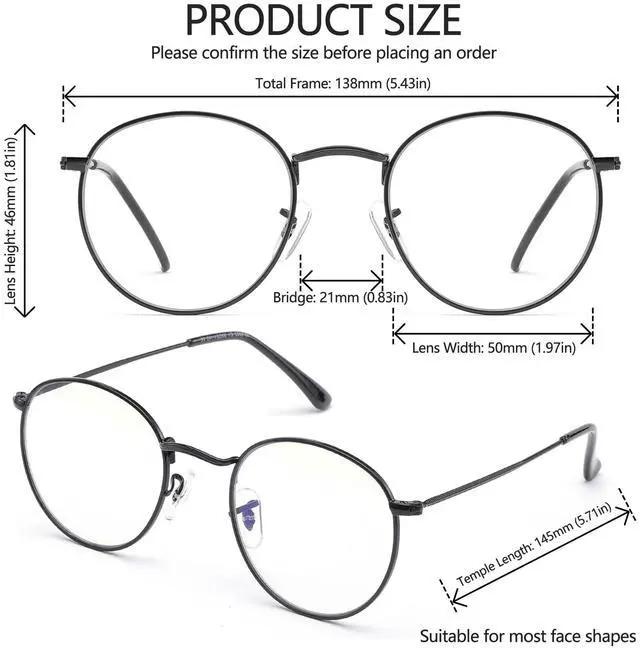 NOTE - These fashion round blue light blocking glasses feature a vintage small frame design. They tend to be on the smaller side for larger faces, so you need to think about it and check the size before making a purchase. ^^ HIGH QUALITY LENSES & UV400 PROTECTION - Clear lenses block more blue rays than others and see more realistic, they are resistant to scratches and water. ^^ INTERCHANGEABLE LENSES - The original lenses can be replaced with your prescription lenses at any store. ^^ METAL MATERIAL & NOSE PADS - The ultra-lightweight stainless steel frame features silicone skin-friendly nose pads, making it weigh only 17g for a comfortable fit.