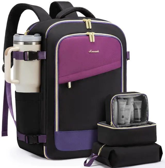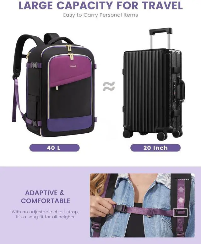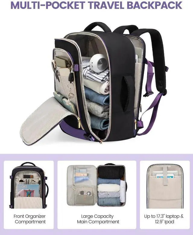 LOVEVOOK Travel Backpack for Today's Woman Elevate your travel style with a backpack that marries fashion with function. Crafted from Sturdy, scratch-resistant materials, this pack stands out in the crowd. ^^ Space Like No Other - A Whopping 40LWhether you're jet-setting for a weekend or heading out for longer, we're talking 40L of spaciousness. Plus, special compartments designed just for your 17.3 inch laptop and 12.9 -inch iPad! Think a weekend's worth of outfits, your tech gear, and then some. ^^ Keep It Clean and Dry Along with 2 packing cubes and an isolated shoe pouch, our backpack features a built-in wet bag.