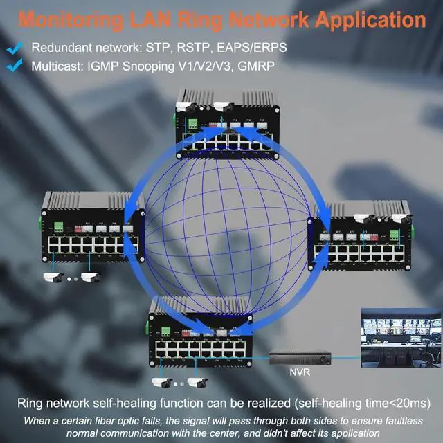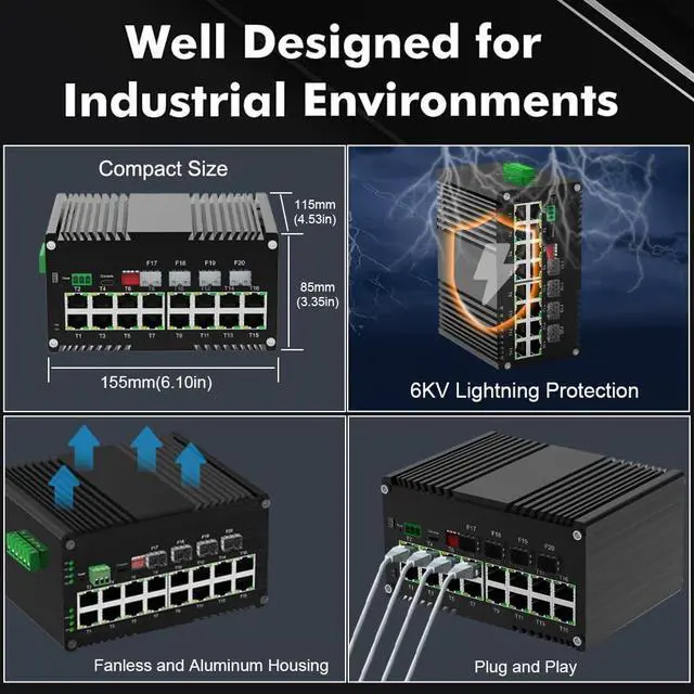 Gigabit 20-Port Configuration The network management switch provides 16 10/100/1000Mbps Ethernet ports and 4 Gigabit SFP slots, satisfies high-speed and reliable connections of multiple devices ^^ Easy Network Management Support Web management, can be done on a LAN and achieve telnet management. Besides the switch complies with the SNMP protocol and can be managed by NMS software ^^ IEEE 802.3 at/af Standard The industrial managed switch complies with PoE standard and per PoE port power output up to 30W. PoE pin assignment 1/2/4/5(+), 3/6/7/8(-). Transmit power and data at the time ^^ Redundant Power Input The network switch has dual power input design, can offer redundant mechanisms for critical applications that need always-on connections.