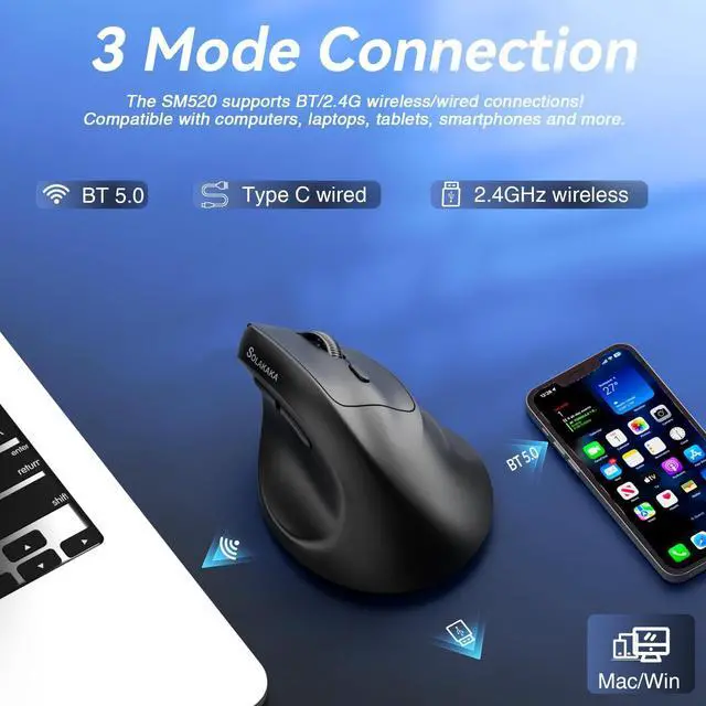 Comfort: This SM520 ergonomic mouse features an ergonomic design. It allows the palm to rest naturally perpendicular to the desktop, relaxing the muscles in the arm and shoulder, and reducing pressure on the wrist. This reduces wrist fatigue and soreness caused by prolonged computer mouse use. In addition, this vertical mouse weighs 2.60 oz, making it very lightweight and easy to use.