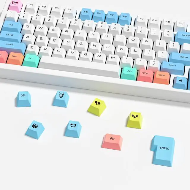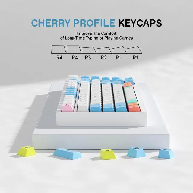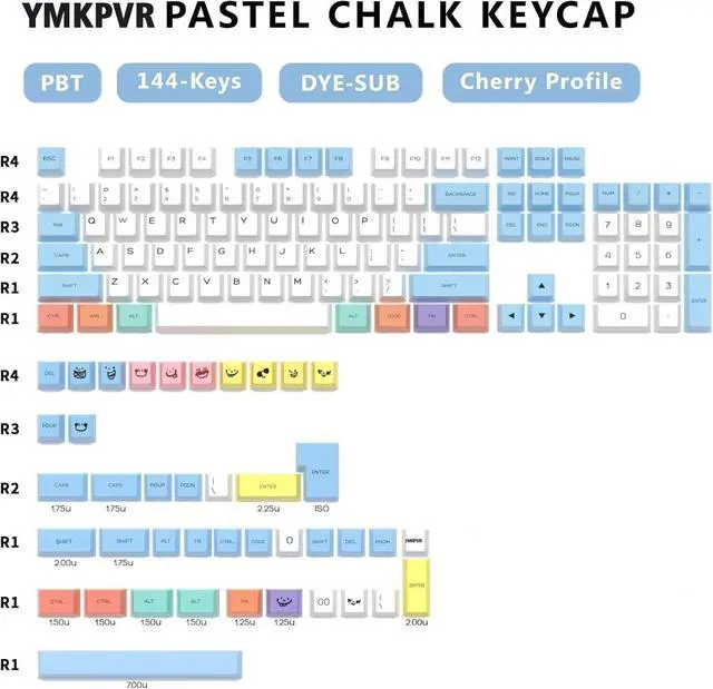 YMKPVR Pastel Chalk Cherry Profile-Cherry Profile keycaps have a trapezoidal design with R1-R4 layout with different height and angle slope, which is ergonomic and makes typing easier ^^ Accessories Included-This keyboard keycap set consists of 144 keycapsand a keycap puller, Keycaps do not include the keyboard. The keyboard in the picture is for display purposes only. Colored keycaps you can DIY your keyboard to your heart's content ^^ Dye Sublimation PBT Keycaps-The patterns on the keycaps use dye-sublimation technology to never fade. Keycaps with thickness will make users feel more texture. PBT is abrasion-resistant, heat-resistant, dirt-resistant, and can be cleaned with water, providing you with a better and comfortable experience ^^ Widely Compatibility-Standardized MX compatible with most MX switches.