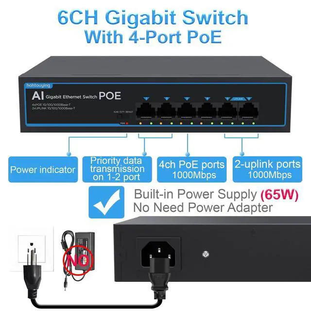 PoE watchdog; 3: With default mode on, the data transmission speed up to10/100/1000 mbs/port ^^ - The efficient and energy conservation 65W power supply is built in the poe switch body and with AC Power cable provided ^^ - hohtouying PoE switch has Strong anti-interference function, Protects the faulty caused by the the network port short circuit. If the RJ45 cable was cut off by somebody, you just need to Reconnect this AC power cable again, the full PoE Port will be recovered ^^ Fanless design reduces power consumption and ensures silent operation ^^ - Every hohtouying PoE switch is strictly tested for reliability, However electronic products have unexpected failures, In order to make you satisfied, We provide one-year after-sales replacement service and lifetime technical support
