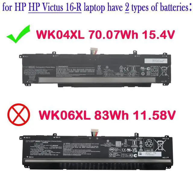 (Note: WK04XL 70.07W h and SD03XL 52.5W h both have 15-FA in their compatible computer models, but they are not compatible with each other and belong to different series. You can open the back cover of your laptop to check the original battery model, and please be careful not to buy the wrong one. ) ^^ Purchase Skills Please open the back cover of the laptop before ordering and make sure that the original battery model is consistent with the listing. After getting the battery, please install the battery correctly, make sure that the battery connector is firmly connected to the laptop motherboard, and use the original charger to charge the laptop. Discharge the new battery to 5% (not 0%), then charge and cycle 3-4 times to wake up the new battery. ^^ EPYOBW Promise All EPYOBW's batteries are certificated by UL/CE/FCC/RoHS. Our batteries are tested by strict quality control standards to ensure that the capacity is true, stable current, low self-discharge. And we also have short circuit, overheat, and overload protections. We are confident in the performance of replacement batteries and professional service.
