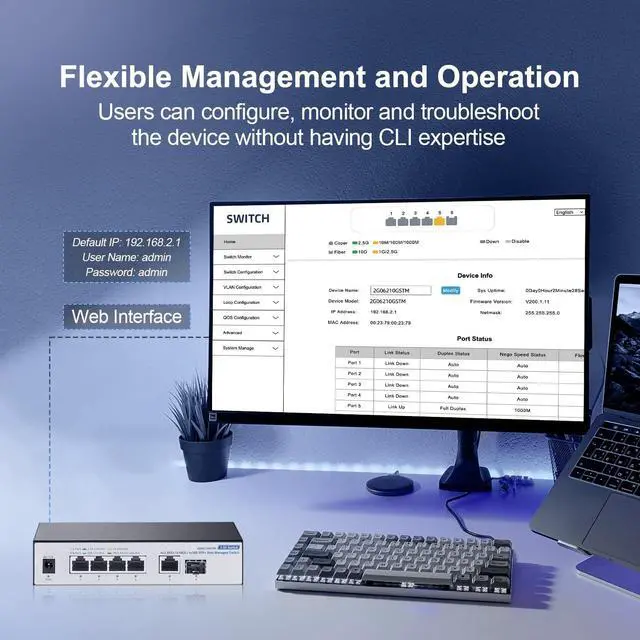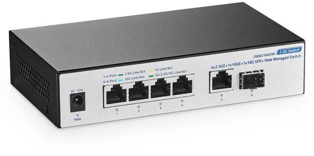 2.5G and 10G Ports 42.5G RJ45 ports, support 2.5G /1000M; 110G RJ45 ports, support 10G/5G/ 2.5G /1000M, 110G SFP+ Slot, auto-sensing device speeds for seamless bandwidth upgrades. ^^ Advanced Web ManagementThe Multi-gigabit managed switch supports device/port status query and various L2 configurations, such as VLAN, QoS, security, multicast, static aggregation, LACP, MAC address table, diagnostics, and so on. The functions are more powerful than unmanaged switches.