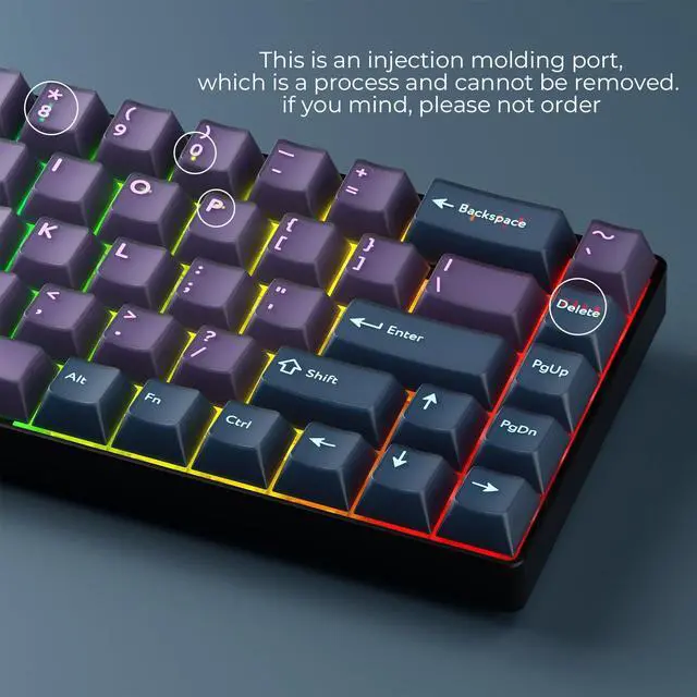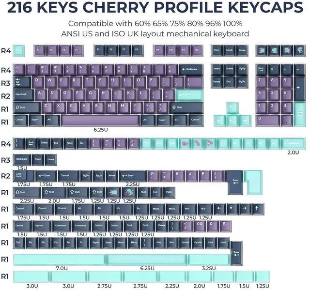 RGB effect (Notes: Because of the semi-transparent outer layer, Some keycaps have a light leakage design, which is a production process requitment, not a quality problem, If you mind, please do not place an order. ^^ Cherry ProfileCherry profile keycaps are shorter and flatter than OEM or SA profiles, offering a comfortable typing experience with a slightly stepped design. ^^ Wide CompatibilityThis 216 keys keycap set consists of 108 standard keys and comes with plenty of supplementary keys that you can use them to build keyboards according to your ideas, the keycap set compatible with 60%/65%/75%/80%/96%/1800/100% ANSI US and ISO UK layout mechanical keyboards with MX-stem(cross-shaped) swithes, additionally, the keycap sizes for the spacebar include 6.25 u and 7u and other size spacebar for alice keyboard. ^^ What You GetIncluding 216 keys keycaps, packed in a great keycap-specific storage box that can be used to store your idle keycaps for a long time, Not include keyboard, the keyboard is just for demo not included.