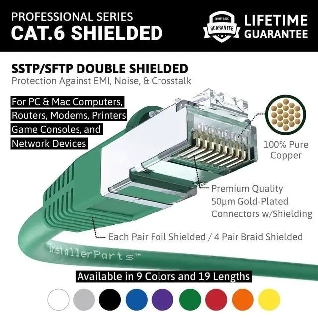 Shielded CAT6 Cable: InstallerParts SSTP / SFTP (Screened Foil Twisted Pair) patch cables are doubled shielded with an overall braided screen and foil screened twisted pairs for the best prevention of noise, electromagnetic interference and crosstalk. ^^ High