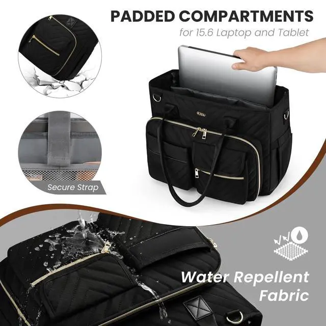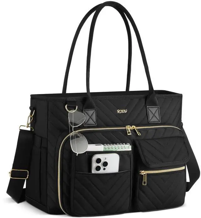 Large CapacityLarge tote bag measures 16.54 x 11.81 x 5.91 inches, teacher bag features a padded laptop sleeve for excellent impact protection. Work bags for women with 10 inner pockets could easily hold all your daily necessities/college supplies/teaching materials/medical supplies in an organized way. ^^ Long Lasting FabricThe tote bag is crafted from durable fabric with a water-repellent & scratch finish. Smooth zippers, sturdy handle and adjustable padded shoulder straps, work tote bag prefect combination of stylish and functional. High quality quilted teacher laptop tote bag aims to provide a sturdy and reliant user experience.