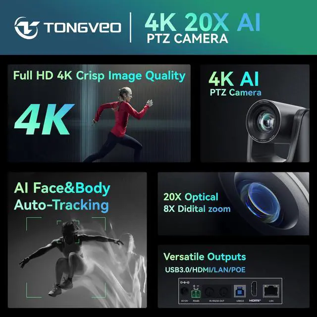 CRYSTAL-CLEAR 4K VIDEO & 20X OPTICAL ZOOM Upgrade your livestreams and meetings with the TONGVEO 4K PTZ Camera, delivering ultra-sharp resolution and powerful 20X zoom. Perfect for pastors in church worship, presenters on stage, or classrooms, capturing every detail with clarity from up to 80 feet. ^^ AI AUTO-TRACKING & FLEXIBLE CONTROL The AI PTZ camera automatically tracks speakers with advanced face and body recognition for smooth, professional video. Supports multiple presets for pulpit, wide view, or group shots. Pan, tilt, and zoom can be controlled via remote, software, or optional joystick for effortless operation.