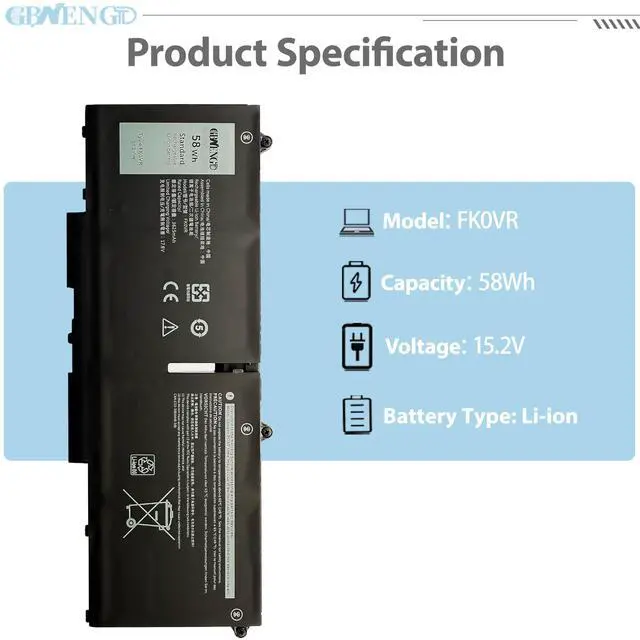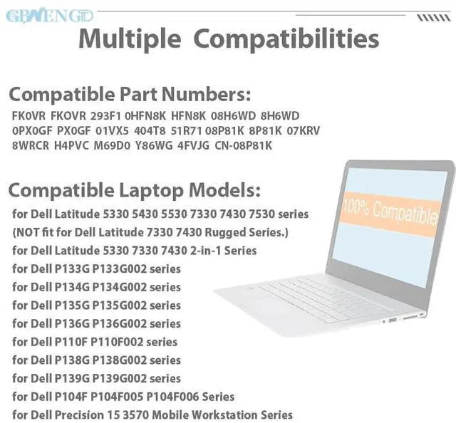 Battery Condition: 100% brand New from Manufacturer. ^^ Compatible Model for Dell Latitude 5330 5430 5530 7330 7430 7530 series (NOT fit for Dell Latitude 7330 7430 Rugged Series. ) for Dell Latitude 5330 7330 7430 2-in-1 Series for Dell P133G P133G002 series for Dell P134G P134G002 series for Dell P135G P135G002 series for Dell P136G P136G002 series for Dell P110F P110F002 series for Dell P138G P138G002 series for Dell P139G P139G002 series for Dell P104F P104F005 P104F006 Series for Dell Precision 15 3570 Mobile Workstation Series ^^ Compatible Part No#FK0VR FKOVR 293F1 0HFN8K HFN8K 08H6WD 8H6WD 0PX0GF PX0GF 01VX5 404T8 51R71 08P81K 8P81K 07KRV 8WRCR H4PVC M69D0 Y86WG 4FVJG CN-08P81K ^^ Quality First We have passed a series tests of short circuit, overheating, and overload protection before shipments. The newest generation chips, grade A cell battery, provide long cycle life, stable performance and broad compatibility. ^^ Service First-rate We promise 30-Day Refund & 1-Year Warranty. For any battery questions, just feel free to contact us for help via the order or click on"GBNENGTD", then you can see "Ask a question" on the page. We are here to serve for you for any battery problems within 24 hours.