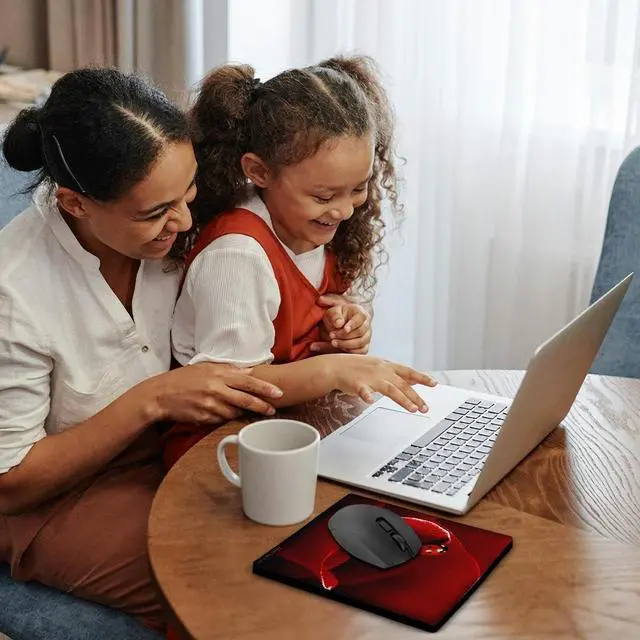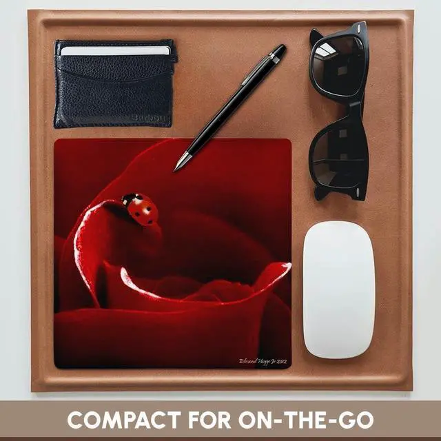 Ladybug Love Mouse Pad is 8" x 8" x. 25" and is made of heavy-duty recycled rubber. Matte finish image will not fade or peel. Machine washable using a mild detergent and air dry.
