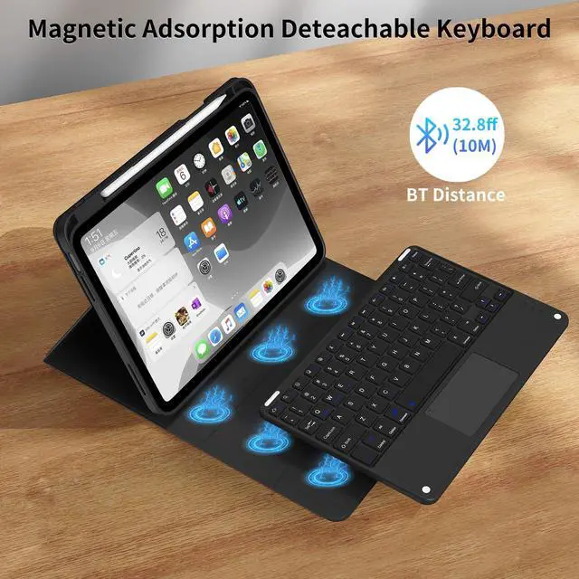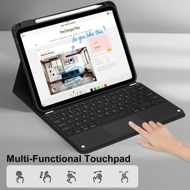 The protective shell can be placed at different tilt angles to adjust the optimal viewing angle, very flexible and user-friendly. ^^ Buit-in Pencil Slot & Sturdy PU MaterialThe ipad 11/10th generation keyboard case has a convenient right side built-in pencil slot that easy to storage and remove your pencil (Apple Pencil is Not included). Premium PU leather cover is waterproof, scratch proof and fingerprint proof, providing full protection for your beloved tablet. ^^ High-Precision Quick Navigation TrackpadThis iPad keyboard case features a responsive and reliable trackpad that allows you quickly navigate your tablet with tap, swipe, scroll and switch apps etc.