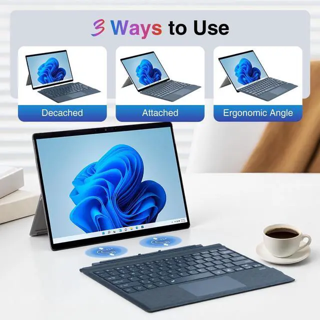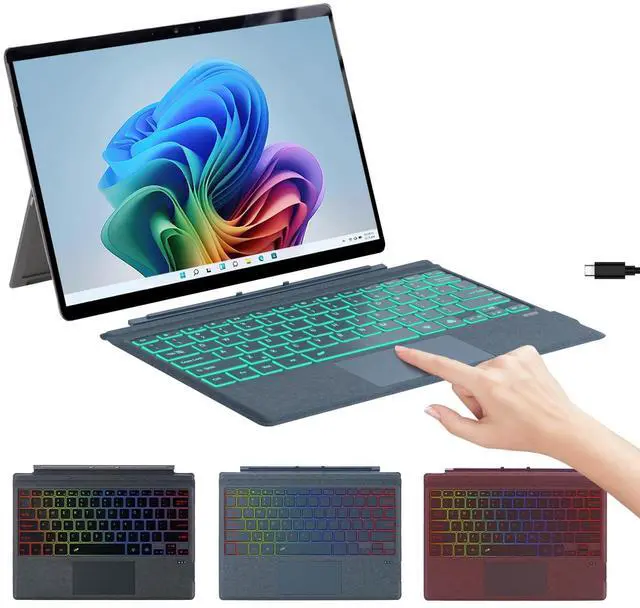 Typc-C Charging: Connect your Surface Pro tablet via wireless Bluetooth, it can be typed normally even after detached. It can be fully charged in about 2h by Type-C charging cable, support charging and using at the same time, without consuming your tablet power. ^^ Slim & Lightweight & Microfiber Leather: Using microfiber fabric similar to the original keyboard, it is thin, lightweight, scratch-resistant, wear-resistant, does not leave fingerprints, feels comfortable, and protects the screen. The keyboard weighs only 0.72 pounds, making it easy to carry without any burden. ^^ 7-Color Backlight and Long Lasting
