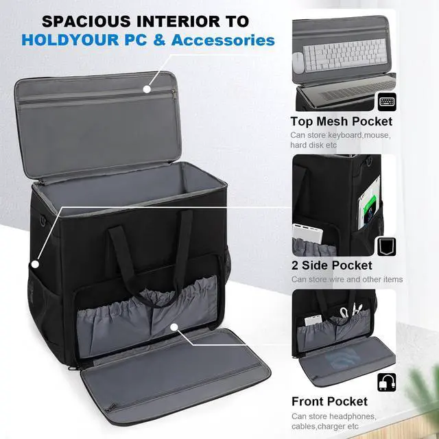 Carry Your Desktop Tower: Our tower PC case carrying bag is purpose-built for desktop tower cases. The size of the bag is 20.67 18.9 10.23 in, it not only fits your PC tower but also leaves room for essentials like a graphics card, keyboards, cables, and more. Please measure your desktop tower to ensure compatibility before ordering. ^^ Padded, Durable