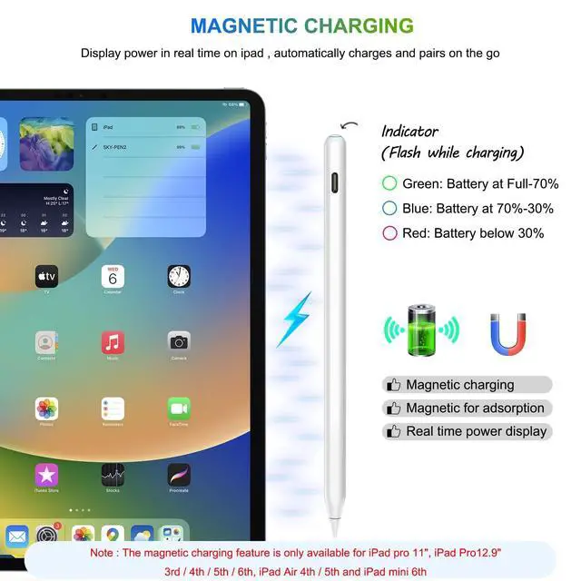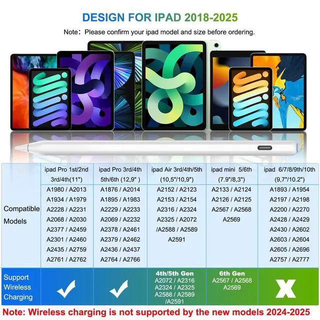 DESIGN FOR IPAD 2018-2025: This pencil for ipad is compatible with ipad 6/7/8/9/10/11 generation, ipad Air M2/M3/3/4/5 generation, ipad Mini (5/6 generation), ipad pro 11" M4/M5/1/2/3/4 generation, 13" M4 M5 and 12.9" (3/4/5/6 generation), this is definitely the best alternative to the pencil 2nd generation.