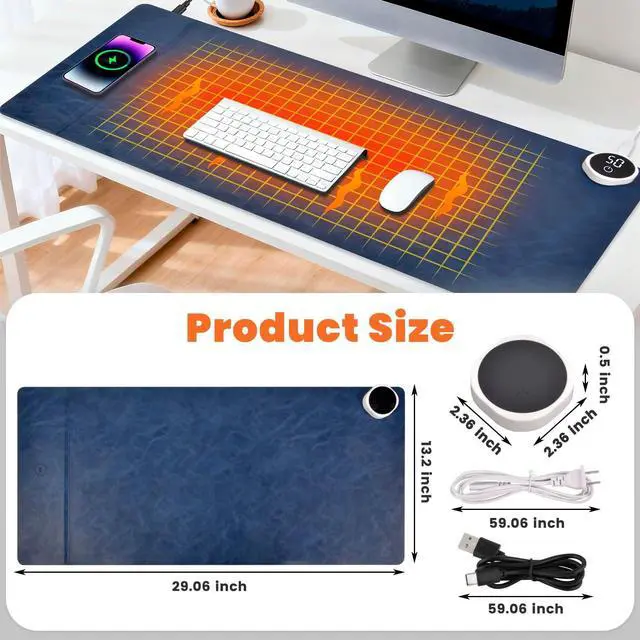 ^^ QUALITY PU LEATHER MOUSE PAD - Crafted from durable PU leather, our heated gaming mouse pad hand warmer resists scratches, stains, heat, and scuffs. It's incredibly easy to cleanjust wipe it down with a damp cloth. The micro-textured, waterproof fabric surface is complemented by stitched edges for enhanced durability. Plus, the natural rubber base provides a superior grip to keep it firmly in place during intense gaming sessions. ^^ MULTI-OCCASION APPLICATION - This charging desk pad is perfect for year-round use. When the heating function is off, its smooth, comfortable surface serves as an excellent mouse pad, keyboard rest, desk protector, and writing surface.