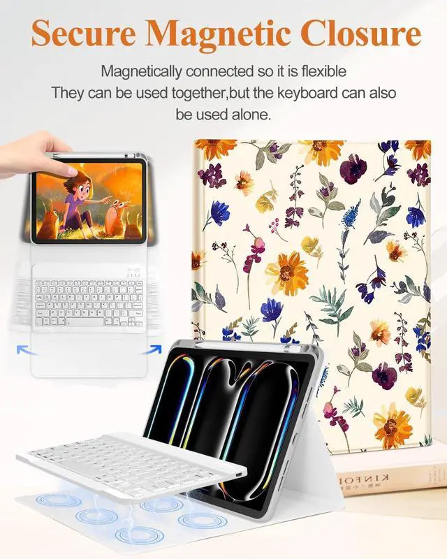 Wazzasoft for iPad Pro 11 inch Case with Keyboard M4 - Pencil Holder Folio Women Girls Cute Kawaii Unique Design for Apple Tablet Cover Pro 11 2024, Color Flower
