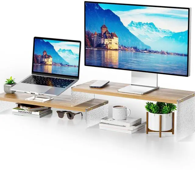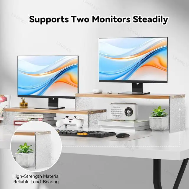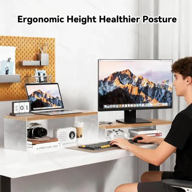 Dual Computer Stand Design: Our Monitor Stand Riser for Desk can accommodate two computer monitors, and even has extra space for office supplies such as mouse and keyboard, providing you with a comfortable office home environment ^^ Ergonomically Designed
