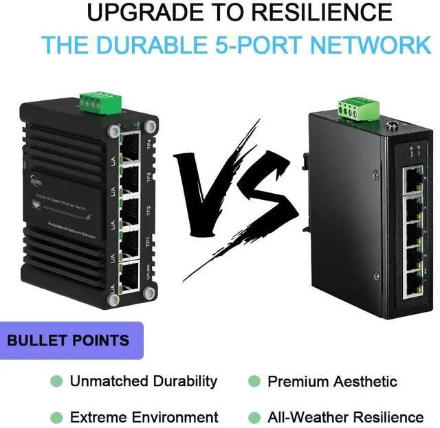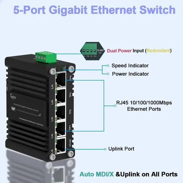 High-Speed Gigabit Networking: 5 auto-sensing 10/100/1000Mbps RJ45 ports (including 1 uplink port) deliver reliable plug-and-play connectivity for industrial applications.