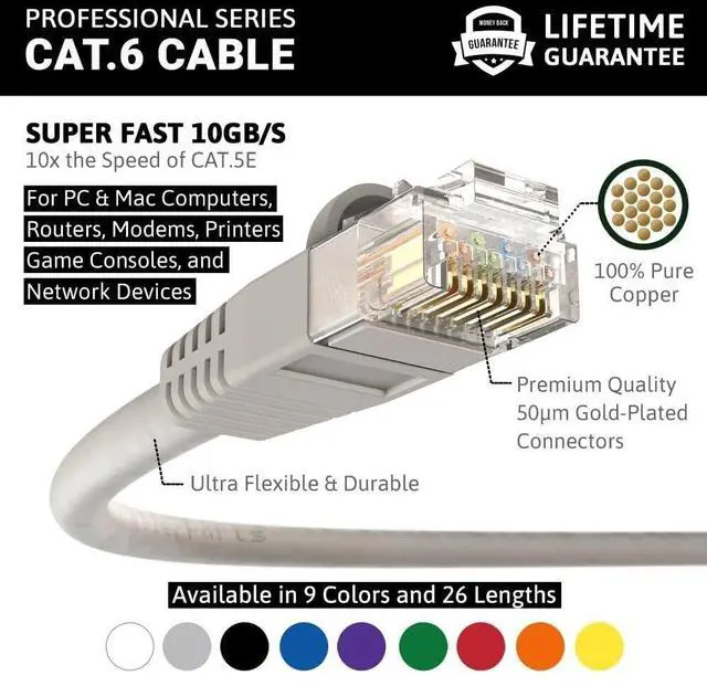 Our cables use high quality, long-lasting materials and feature A highly durable design at an affordable price. ^^ 50 Micron Gold Plated Contacts RJ45 plugs with 50 Micron gold plated contacts and molded strain relief boots provide secure network connection and durability. ^^ Maximum Compatibility Use the Cat6 patch cable to connect devices on a Local Area Network (LAN), such as laptops, PCs and Mac, network servers, printers, routers, switches, game consoles and more. TIA/EIA T-568B standard wiring. UL/CULl listed. RoHS comliant.