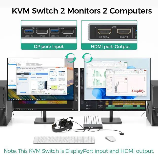 Computers KVM Switch: This DP KVM switcher supports DisplayPort input and HDMI output. This USB KVM switch enables 2 DisplayPort computers to share 2 HDMI monitors and a single mouse and keyboard for control.