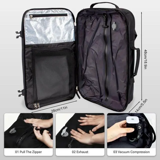 Vacuum Compression System Designed specifically to enhance your travel experience, delivering unparalleled convenience. This vacuum backpack for travel features an integrated vacuum compression bag. Simply zip it up, open the air valve, and the pump automatically creates a vacuum at the valve opening, reducing volume by 50%. When fully expanded, the rucksack offers a capacity of 60L equivalent to a 24-inch suitcase. ^^ Multiple Pockets & Stay Organized The vacuum seal backpack features dedicated dry and wet compartments, enabling separate storage of toiletries and other items for more organised packing.
