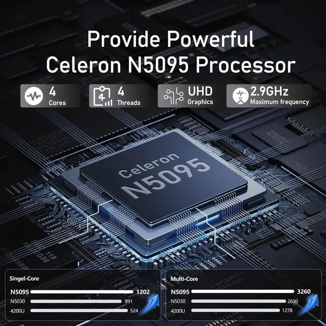 Celeron N5095 ProcessorThis 15.6 -inch laptop PC comes With Celeron N5095 CPU processor (Processor Base Frequency 2.0, Burst Frequency 2.9 ), Ideal for work and play. It supports various office and productivity software, and is compatible with various conventional entertainment and AV applications. ^^ Vibrant 15.6" FHD Display DesignThe small laptop computer packs a 15.6" Full HD (1920x1080) screen with 180 hinge, offering immersive viewing for ideal laptops for college students or laptop for business people. Slim 0.81" profile and 3.6 lb weight make it a portable laptop for on-the-go use. ^^ Powerful Performance for Work & StudyThis laptop computer features a quad-core and laptop 16GB RAM (DDR4), perfect for multitasking on work laptops or student laptops.