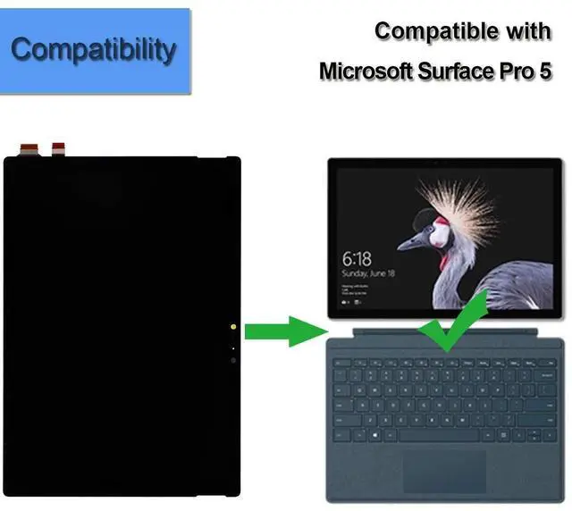 pixelsPackaging: 1 x Touchscreen, 1 x tools Compatible withMicrosoft Surface Pro 5 Pro 6A few tips for intallation1. When you receive the screen, please check if it is in good condition. If the item is damaged on arrival, please let us know by sending us a message. 2. Please carefully remove your cracked screen and connect the new screen to the mainboard, then turn on your phone to see if it works before installation. A hair drier will help you to remove your cracked screen. 3. The cable on the screen is very fragile, do not bend it hard. 4. There're lots of instruction videos on internet, you can watch some videos to learn how to fix it or find a professional technician to help with you. How to protect your cellphone screen1. Do not put your phone together with keys, coins or other metalworks, because these things may scratch your phone screen. 2. Use a screen protector to protect your screen. 3. Keep your phone away from Magnetic materials, because the magnetic materials may cause dead touch if you put them together for a long time.