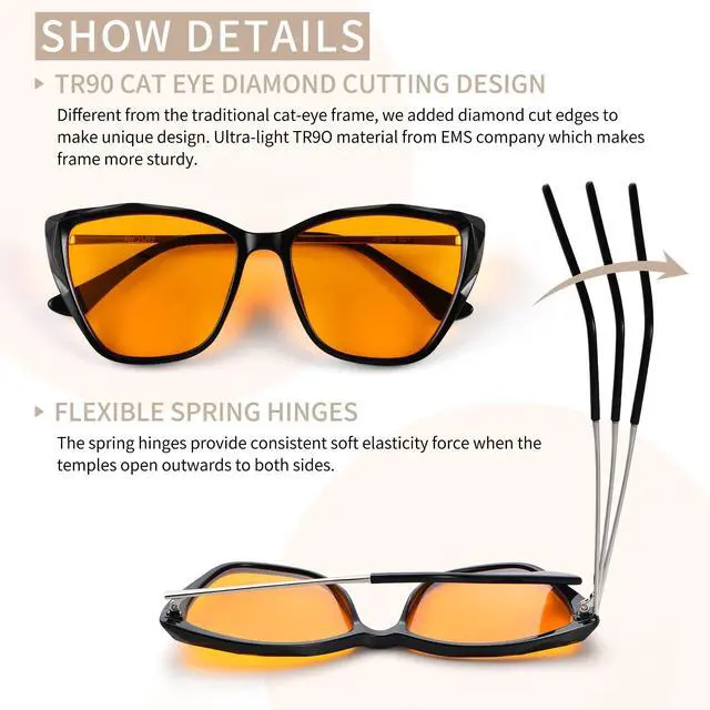 STAY AWAY FROM EYE FATIGUE: With twice the filtering efficiency of standard blue light glasses, these orange lenses block over 98% of harmful rays, significantly minimizing digital eye strain, blurred vision, and migraines caused by prolonged screen timeideal for gamers, night shift workers, and heavy device users. ^^ CAT EYE TR90 FRAME & SPRING HINGES: Constructed from the durable TR90 nylon material, this ultra-lightweight and flexible frame are comfortable for long-term wear. The cat eye frame design not only adds a touch of style to your overall look but also ensures a perfect fit for all face shapes.
