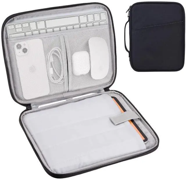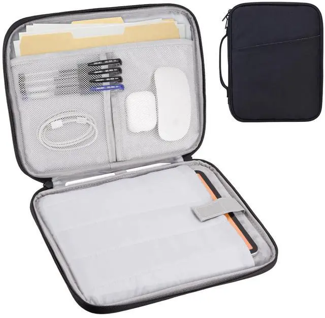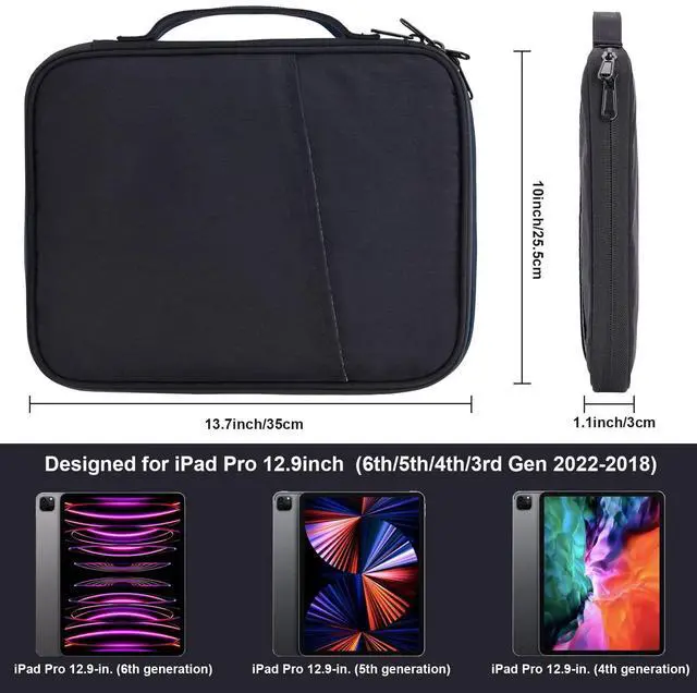 It fits most 12.9 tablet with smart keyboard, also good for A4 documents ^^ portfolio style design, 2 mesh pockets & 1 large compartment for tech essentials, padded protective section for 12.9 inch tablets ^^ Front pocket for notebook, pens or digital accessories ^^ Fabric carrying hand strap for convenient using experience in daily life ^^ Slim & lightweight, can be easily slided into backpack or trolley case