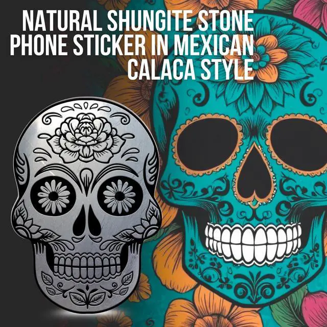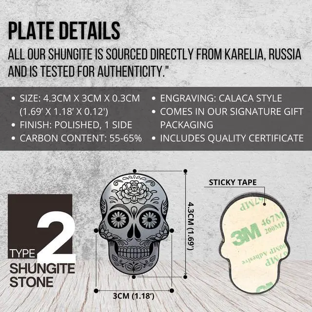 EASY AND COMFORTABLE: You will receive 1 piece of polished shungite sticker in the shape of a Mexican Skull with engraved Calaca style flower patterns. Sticker size is 1.69 x 1.18 (4.3cm x 3cm), thickness ~ 0.12 (~ 0.3cm). The weight of one piece is ~ 0.35 oz (10 grams). Comes in a designer gift box with certificate.